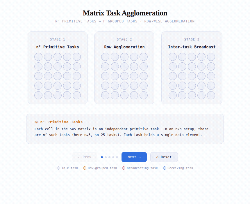 Three-scene interactive: primitive n² task grid → row agglomeration → log-tree broadcast propagation. Click ▶ Animate in each scene. Demonstrates how coarsening task granularity eliminates intra-row communication and changes the broadcast topology from O(n²) messages to O(⌈log p⌉) steps.
